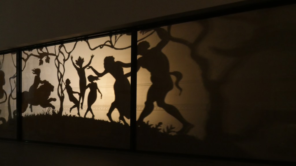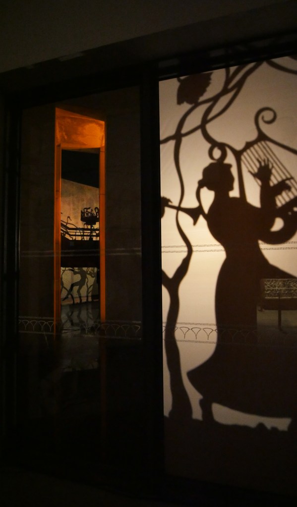 Le personnage de la harpiste, figure inspirée des fresques romaines découvertes à Arles, nous conte les Bacchanales en son et en images. Sur la façade du musée sont projetés des fragments de visages, évoquant le travail des archéologues qui recomposent patiemment les fresques. Ces images intriguent et invitent à entrer dans son monde, son récit. À l’intérieur, la voix de la harpiste accompagne le public dans sa déambulation. C’est au cœur de l’architecture, dans le patio, qu’il découvre un cortège fantasmagorique composé de ménades, animaux, satyres et autres êtres hybrides.