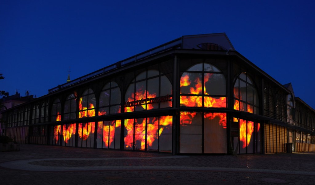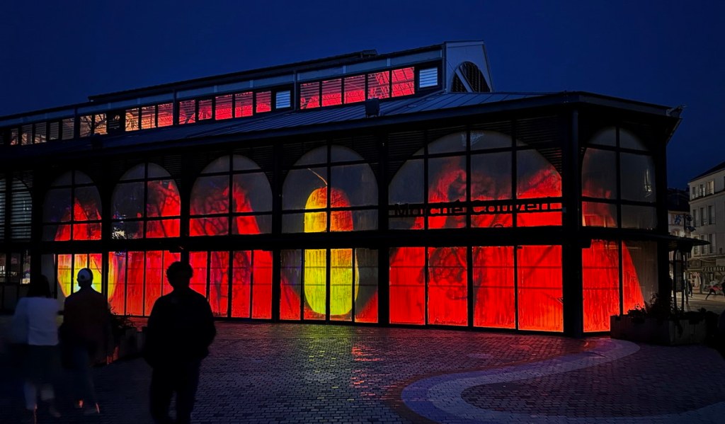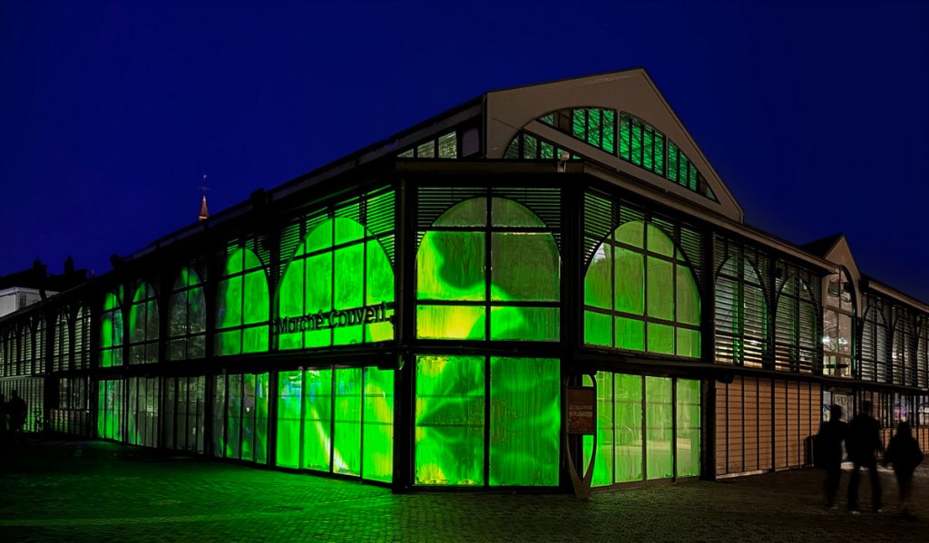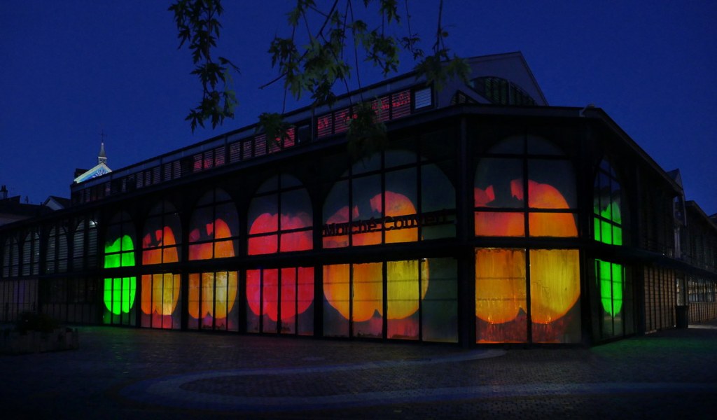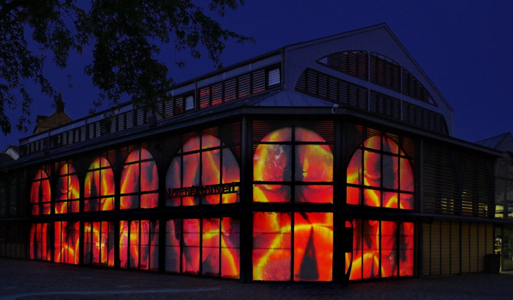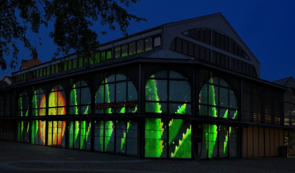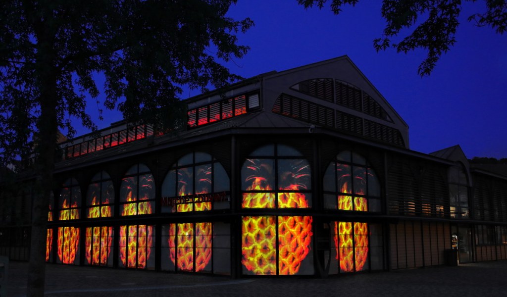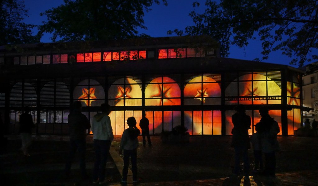 Sur le thème «Le futur de la cité», nous avons imaginé une création en lien avec le marché, son architecture et sa fonction. Notre avenir s’annonce végétal, il est nécessaire de végétaliser les villes mais aussi de faire évoluer nos modes de vies, notre alimentation, pour notre planète et notre santé. Nous proposons de mettre en lumière le marché couvert de l’intérieur, le transformant en une cathédrale aux vitraux colorés. La création vidéo, composée d’images de légumes et fruits éclairés de l’intérieur, invite à un voyage onirique au cœur de la matière végétale. Ces images surprenantes, fantastiques, sont produites par un jeu d’ombre et de lumière, à travers une vision macroscopique de textures en mouvement, organiques. Des paysages fractals apparaissent, évoquant l’infiniment grand, l’infiniment petit. Il s’en dégage une vision cosmique, une sensualité propre aux variations de lumière et de couleurs. Nous devenons alors des explorateurs de l’ordinaire, à la recherche de l’émerveillement, de la beauté du vivant.