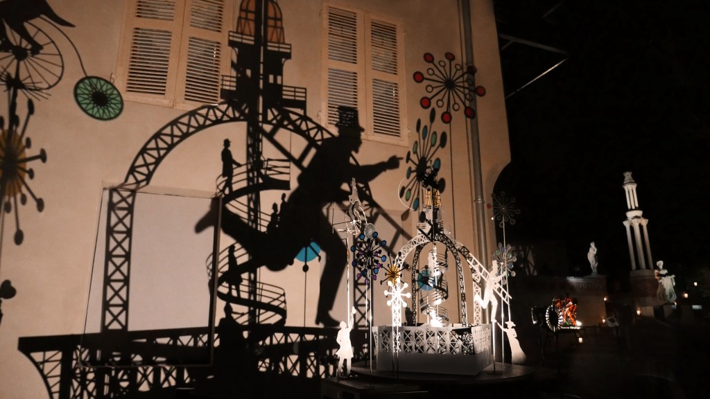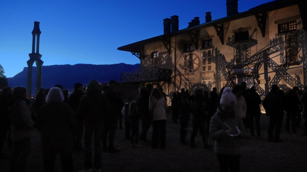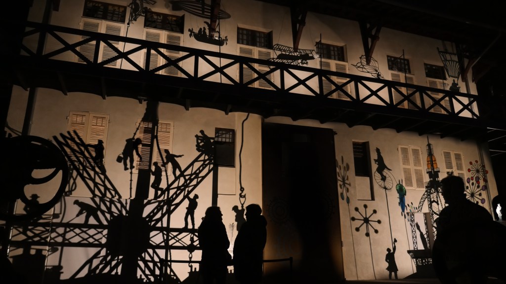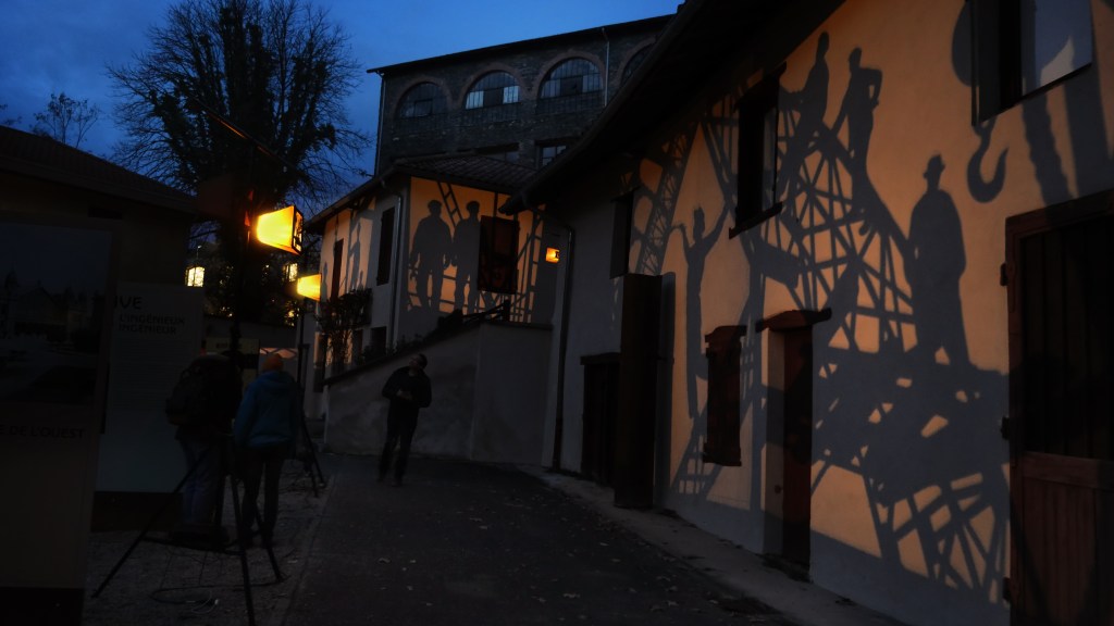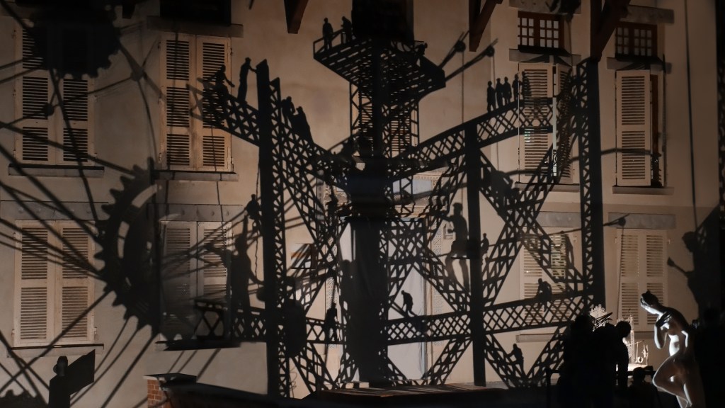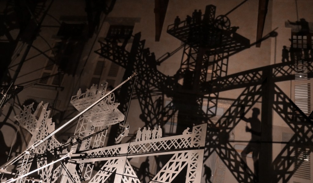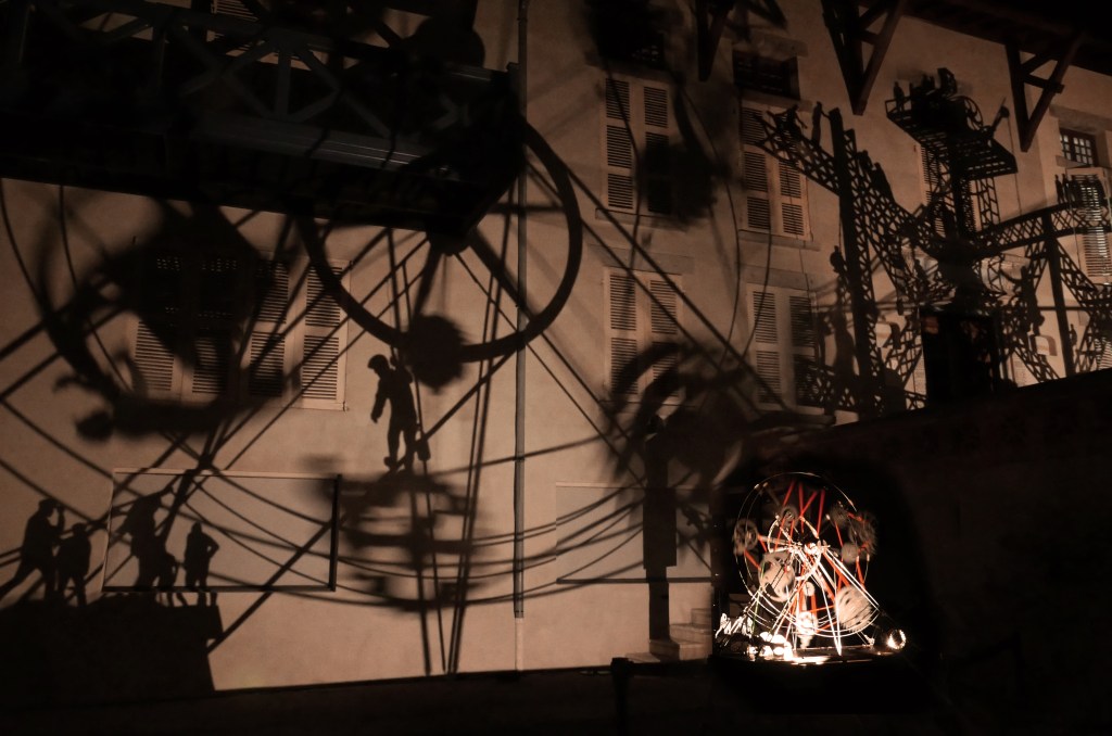 Une série de « machines à images » – assemblage de mécanismes, silhouettes, filtres et sources lumineuses – projettent des ombres en mouvement sur les façades de la Maison Bergès. Lumière, mouvement et son expriment l’émulation technique et artistique de la Belle époque, ce tournant décisif vers la modernité. Les projections composent, à la manière d’un collage surréaliste, une grande fresque inspirée des réalisations de Gustave Eiffel, Aristide Bergès et leurs contemporains. L’ensemble représente une scène de chantier rocambolesque. Des ouvriers au travail mêlés aux rouages des machines, traversant les structures métalliques tels des acrobates ou des funambules, des ingénieurs dessinant leurs projets fantasques ou visionnaires.