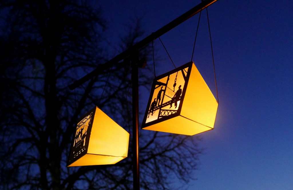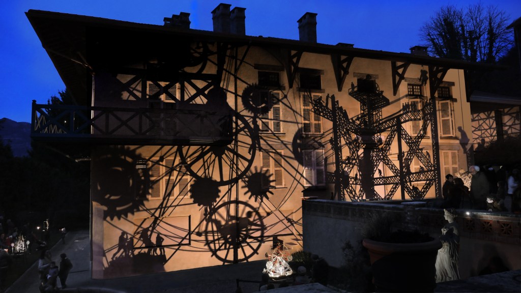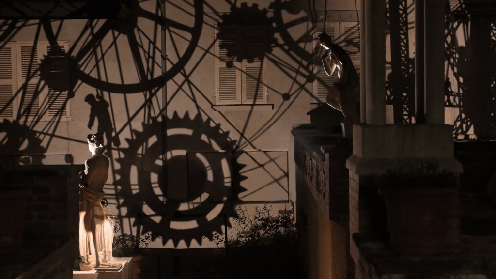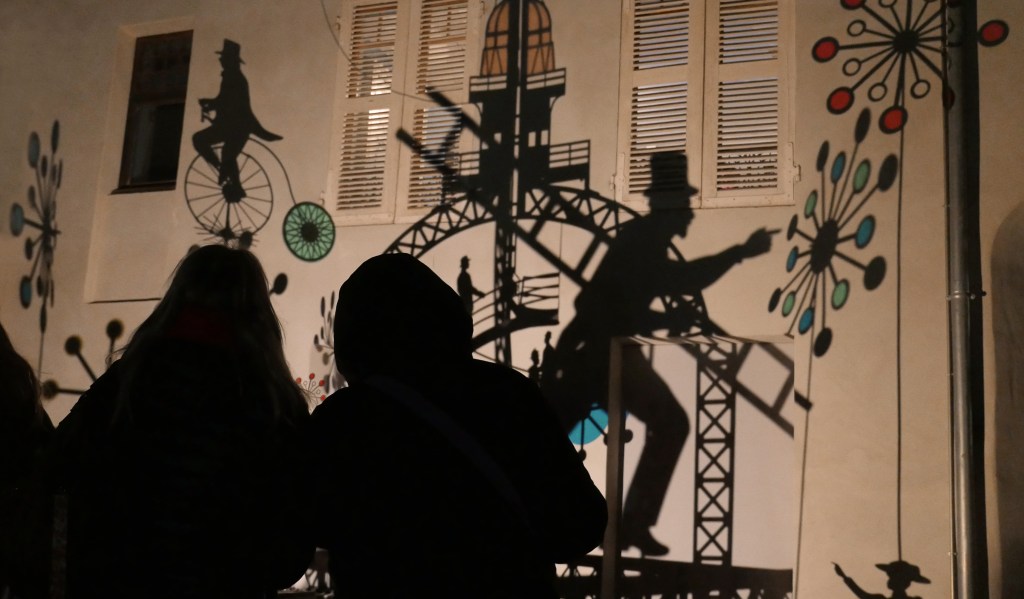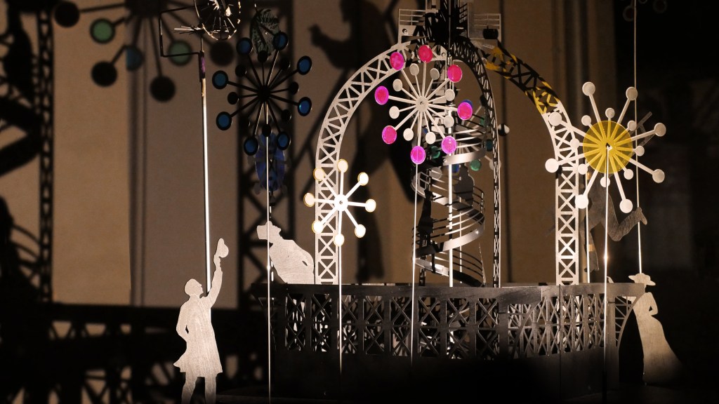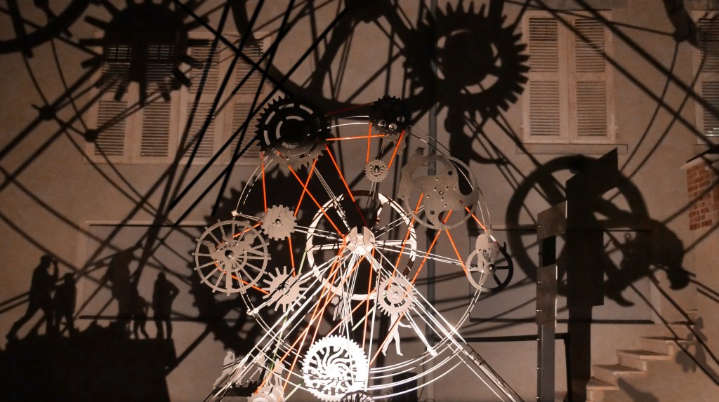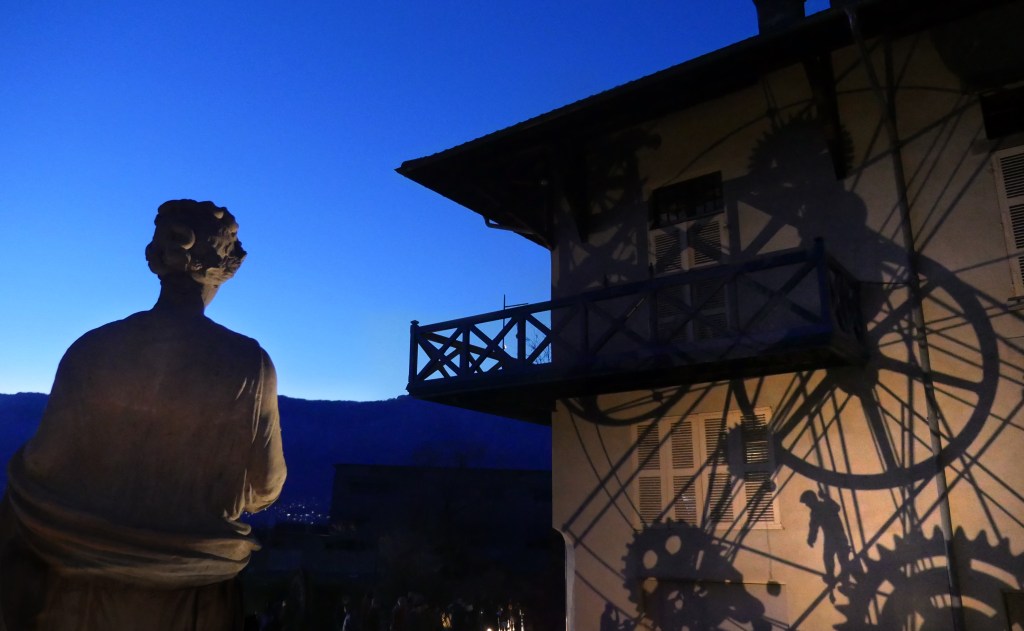 Une série de « machines à images » – assemblage de mécanismes, silhouettes, filtres et sources lumineuses – projettent des ombres en mouvement sur les façades de la Maison Bergès. Lumière, mouvement et son expriment l’émulation technique et artistique de la Belle époque, ce tournant décisif vers la modernité. Les projections composent, à la manière d’un collage surréaliste, une grande fresque inspirée des réalisations de Gustave Eiffel, Aristide Bergès et leurs contemporains. L’ensemble représente une scène de chantier rocambolesque. Des ouvriers au travail mêlés aux rouages des machines, traversant les structures métalliques tels des acrobates ou des funambules, des ingénieurs dessinant leurs projets fantasques ou visionnaires.