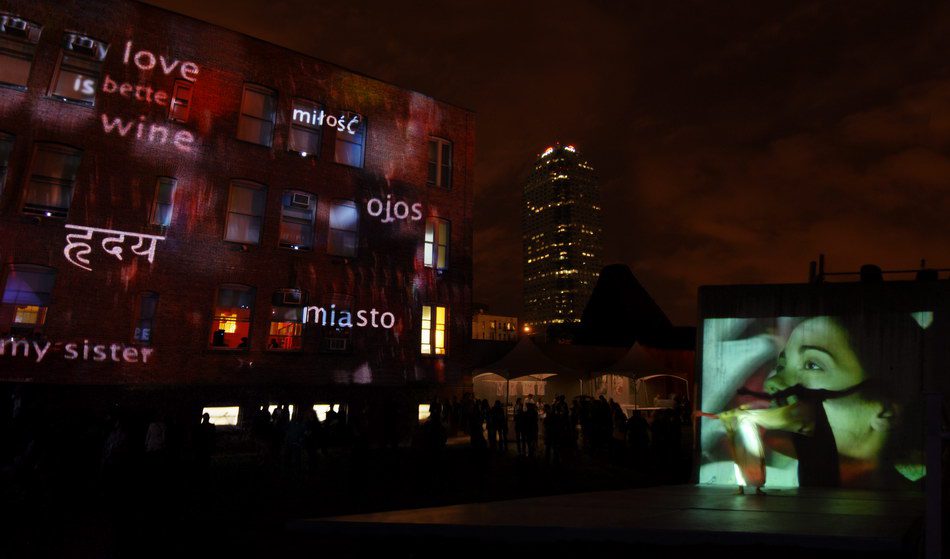 La vidéo, projetée sur les façades, est conçue comme un poème visuel composé d’images et de mots. Elle s’inspire de l’analogie entre corps et paysage qui transparaît du Cantique des Cantiques. Des paysages naturels ou urbains filmés au crépuscule font écho aux images de corps. De ce montage naît une matière lumineuse tantôt abstraite, tantôt figurative, d’où émergent des extraits du poème transcrit dans plusieurs langues.